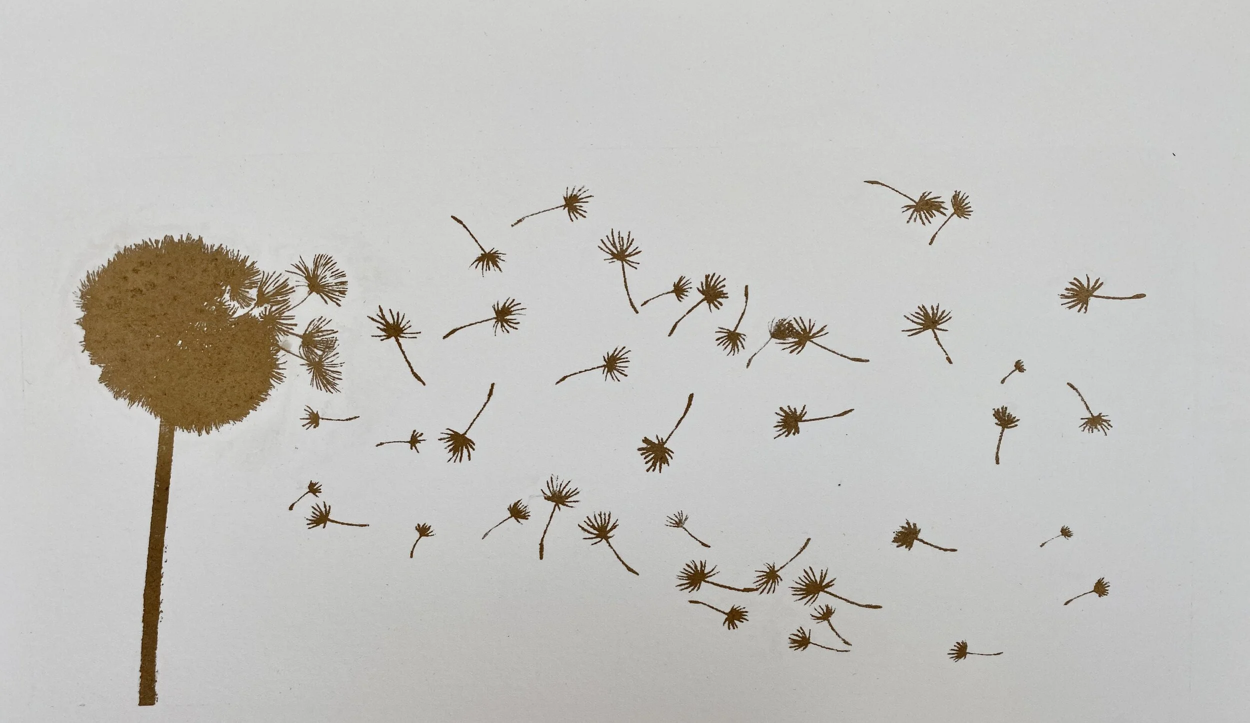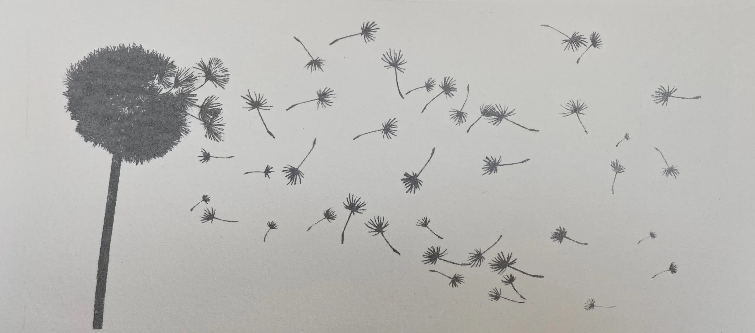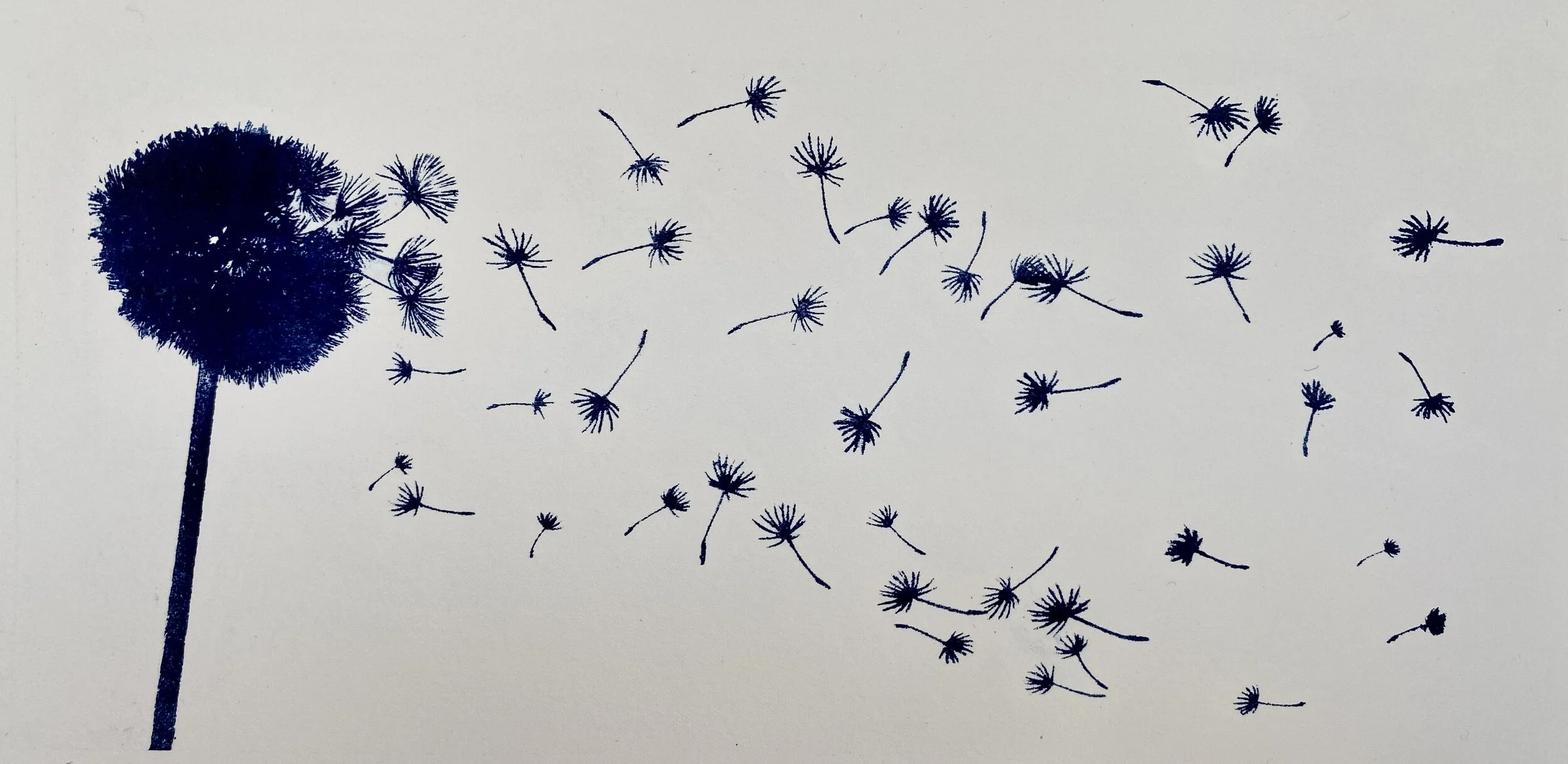 This lithograph was inspired by dandelions, an ongoing series of prints. An earlier dandelion print was called 'From Suns Into Moons' (a quote from Nabokov) and I love the ethereal moonlike quality of a dandelion in seed.