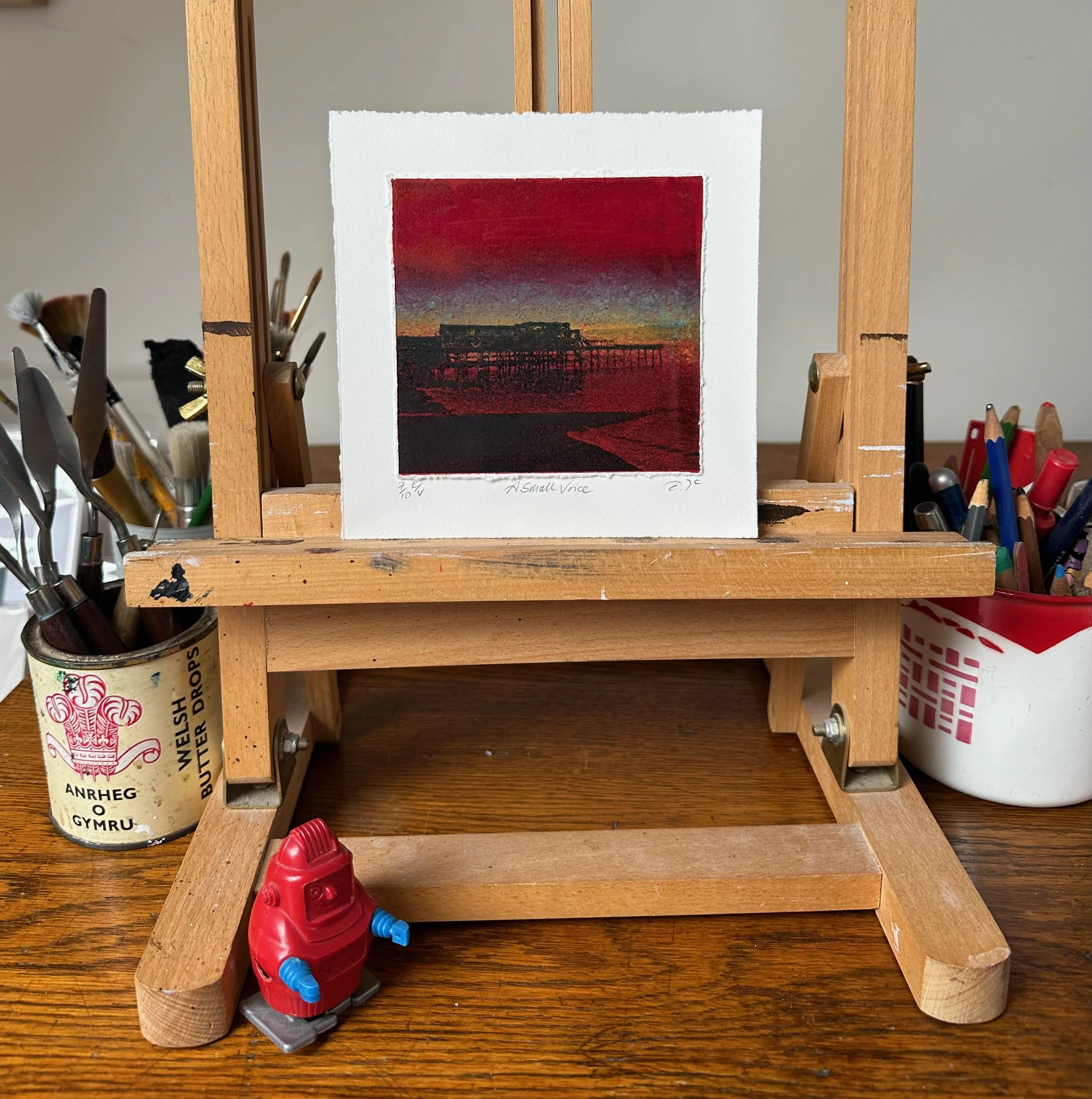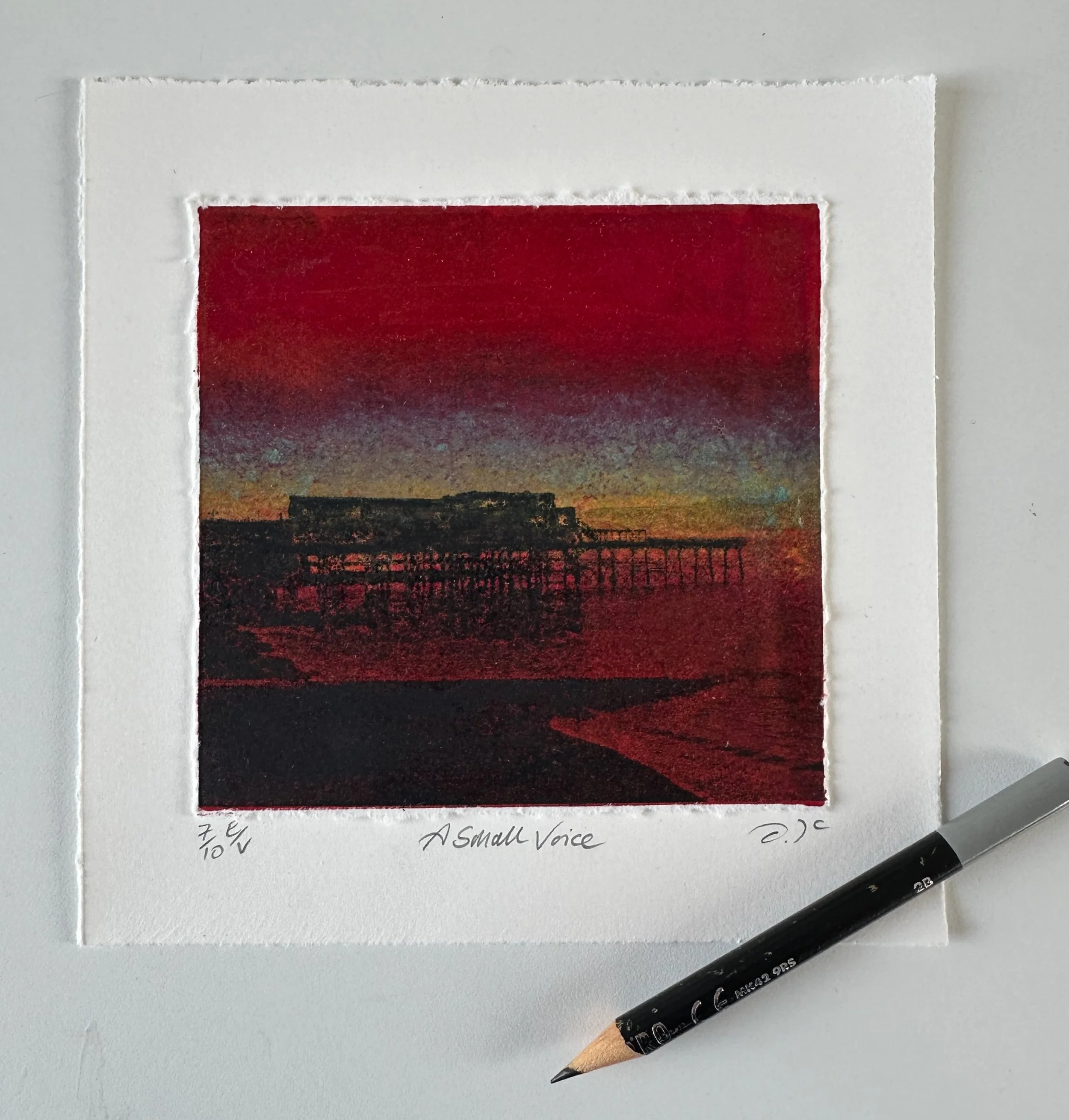 This small 10x10 miniprint is another variation on a theme of the pier at Aberystwyth, where I studied Visual Art. It is a mono print and lithograph, torn to the edges of the image and mounted on Somerset paper.