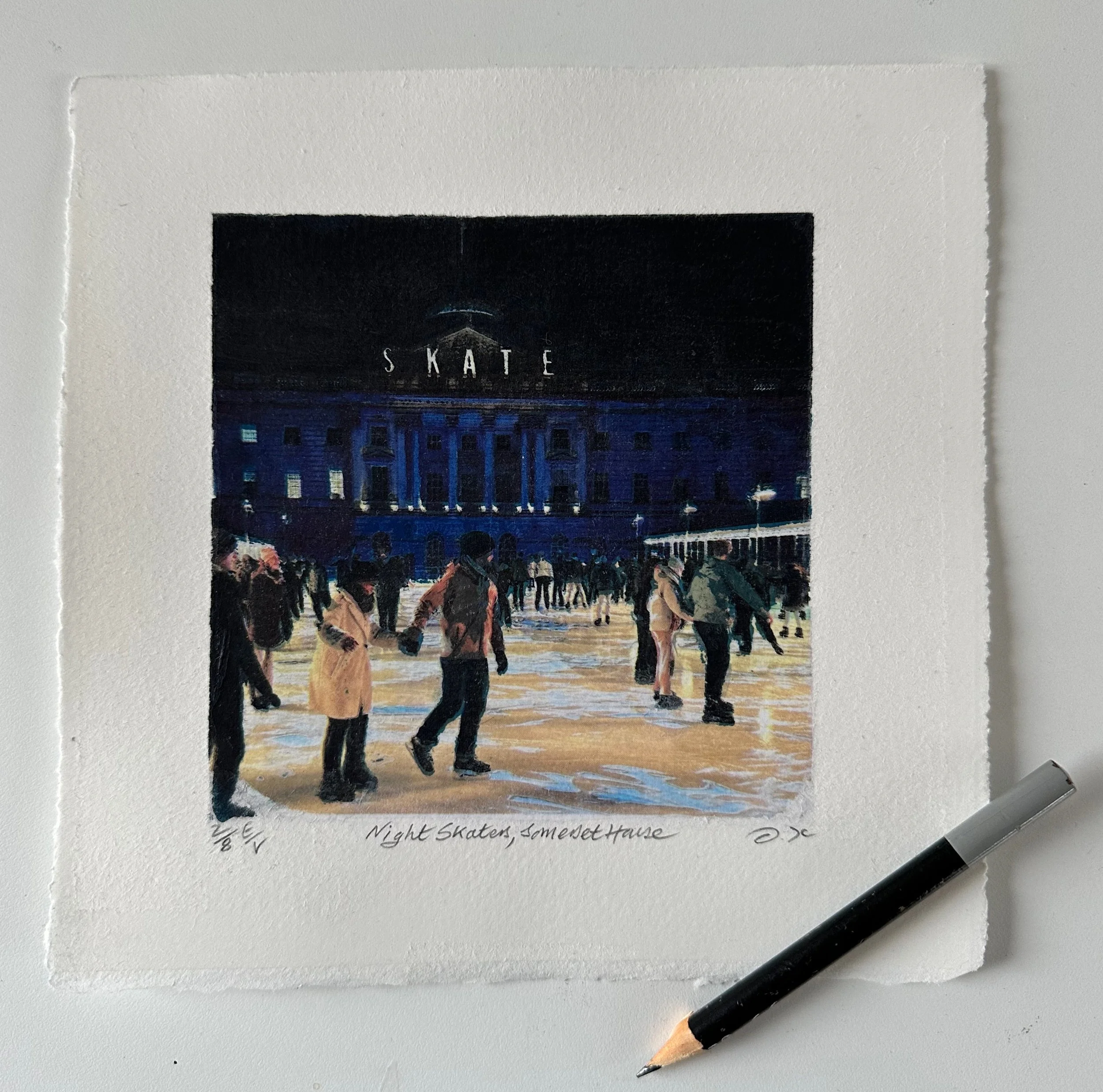This small 12x12 cm midiprint is based on a photograph of the skaters at Somerset House, in London where there is an outdoor ice rink in winter. This layered print is made up of a monoprint base which lends a loose painterly feel for the background, a lithograph second layer to add some structure followed by an image transfer to bring back a little of the original photograph.