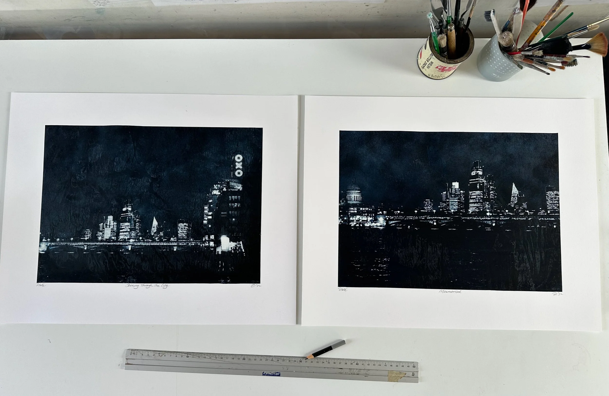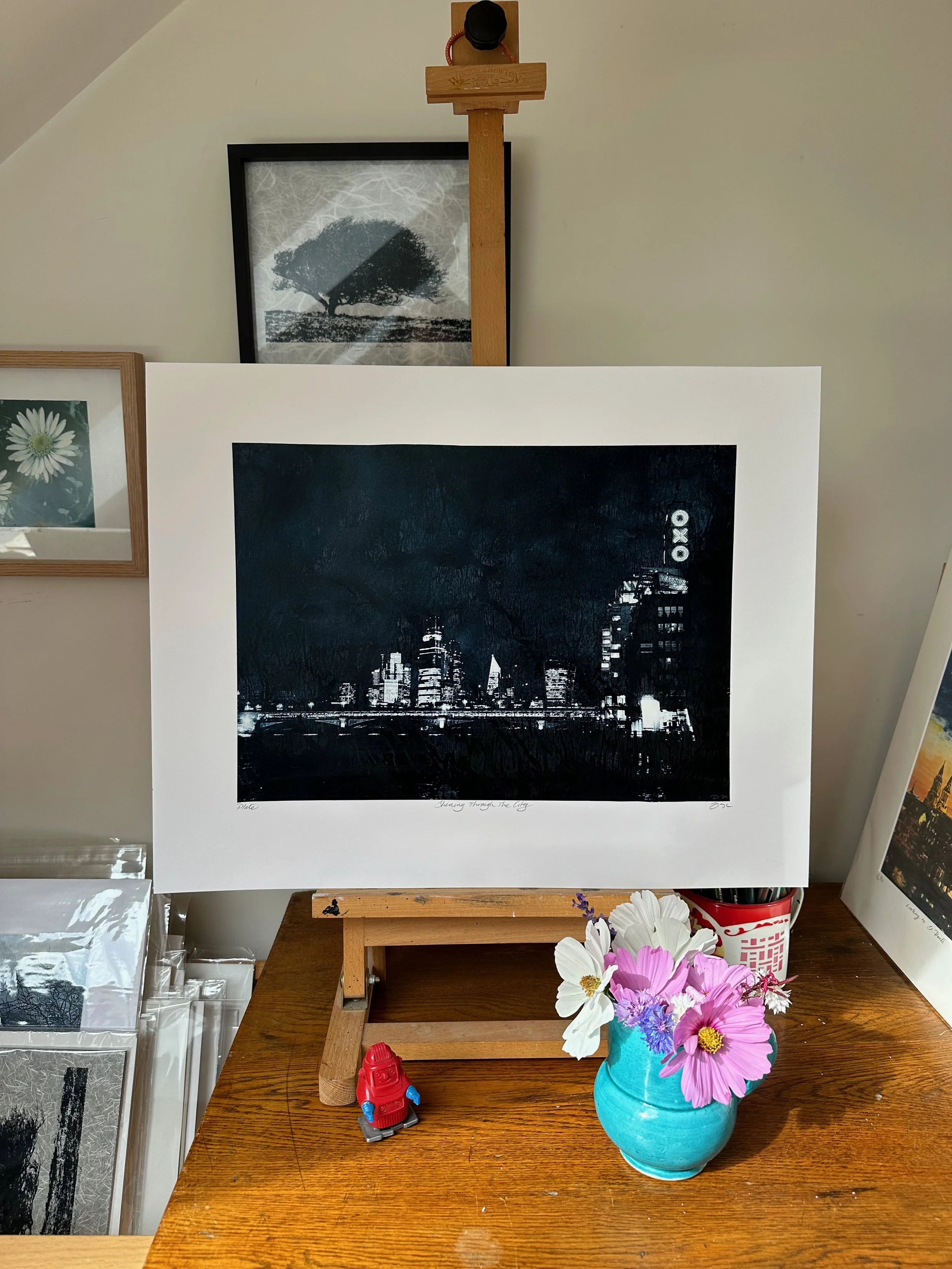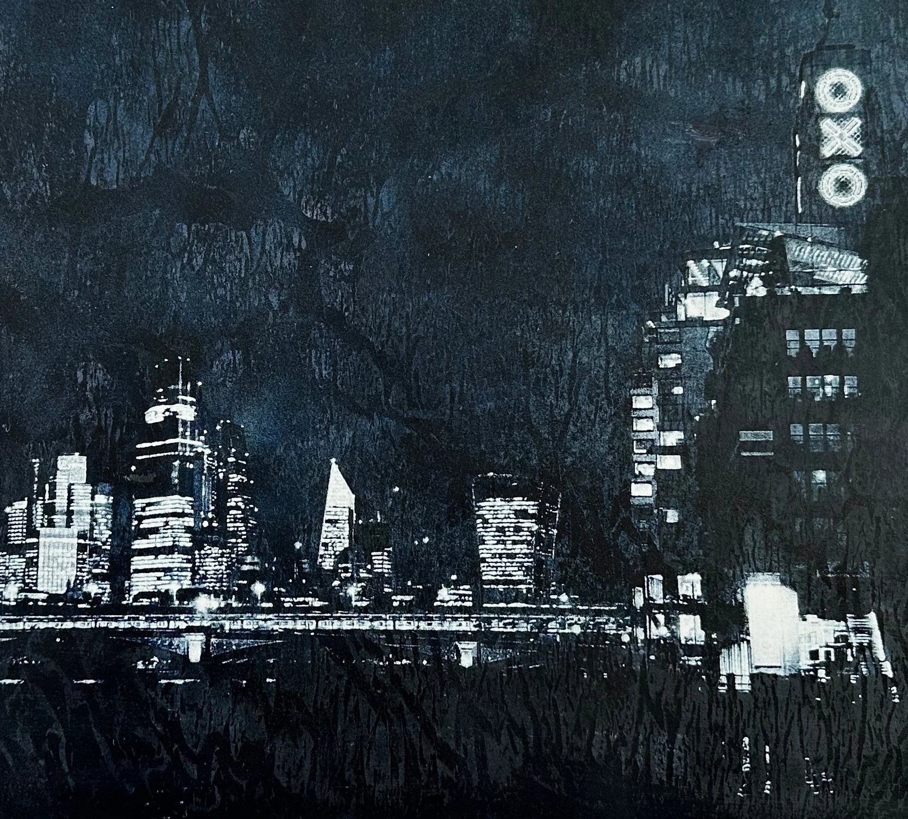 'Shining Through The City' is the view looking towards the Oxo Tower and Blackfriars Bridge at dusk from Southbank, with the lights and reflections on the Thames.