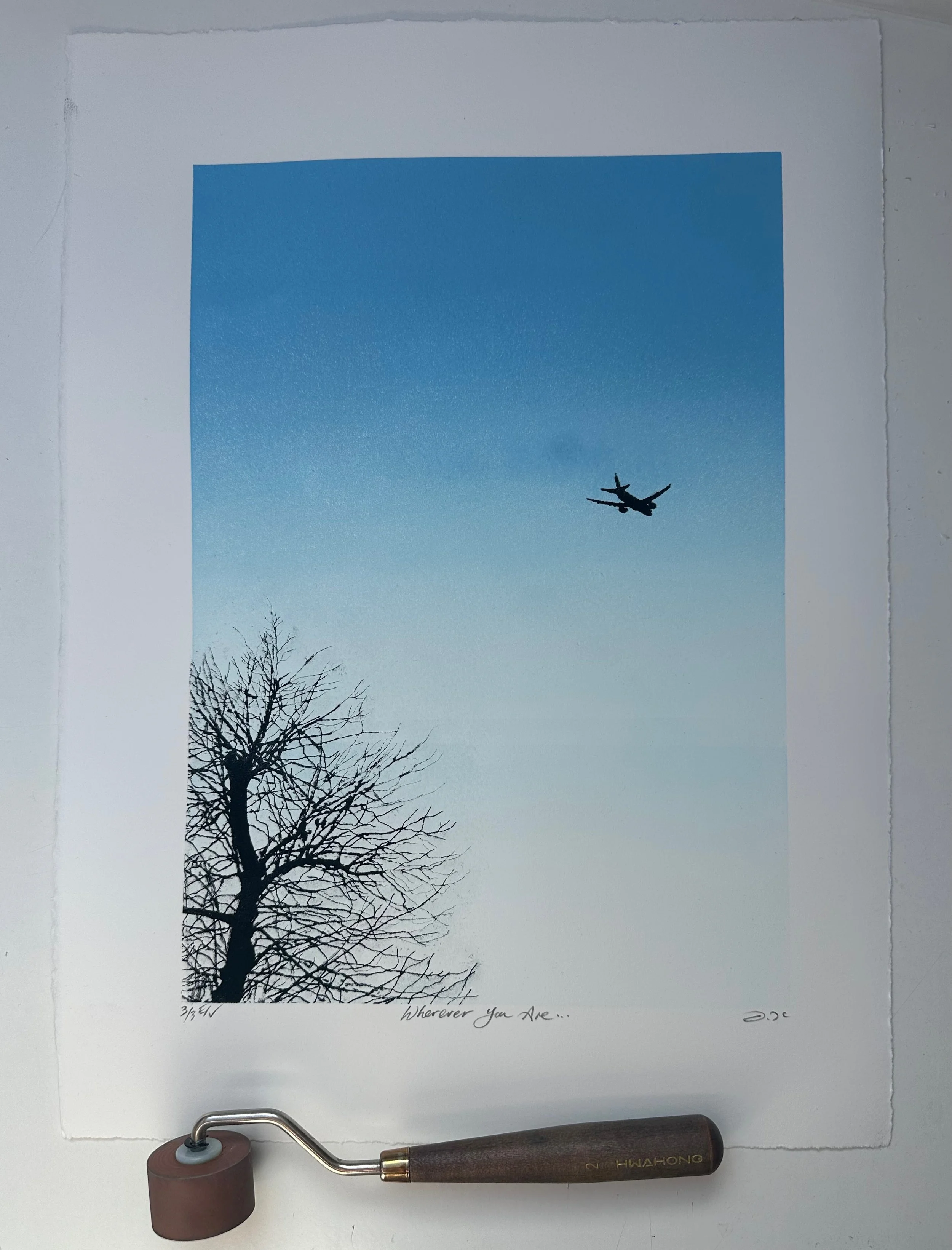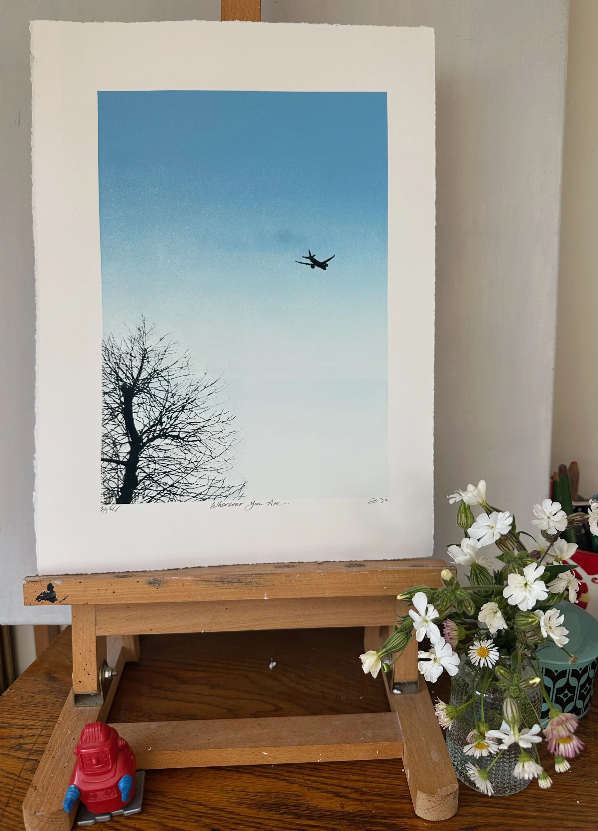 This larger version of a previous print was made as a commission for a friend who was missing a family member that was many miles away. Both this and the original lithograph are based on the planes that fly over where I live on their way to land at Heathrow. This version is roughly A4 in size, and differs from the original in that it is a monoprint and lithograph without the image transfer, so has a sharper more wintry feel to it.
